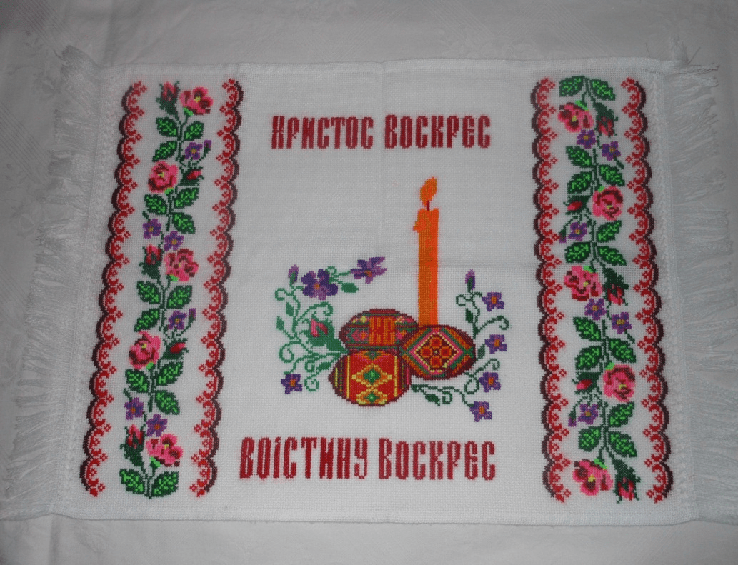 По центру пасхальной корзины ставился кулич с зажженной свечой. По традиции свеча отгоняла злых духов, защищала от сглаза, болезней и беды. Затем освященные яства накрывались вышитым полотенцем, которое после освящения имело священную силу.